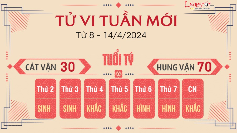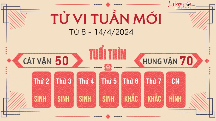 Vận hạn lớn nhất trong tuần 8 - 14/4 của Tuất liên quan tới tiền bạc do ảnh hưởng của Đại Hao, nhưng may mắn có Giải Thần cát tinh cứu vớt nên cũng bớt lo lắng được phần nào, hạn nặng đến mấy cũng được giảm bớt.