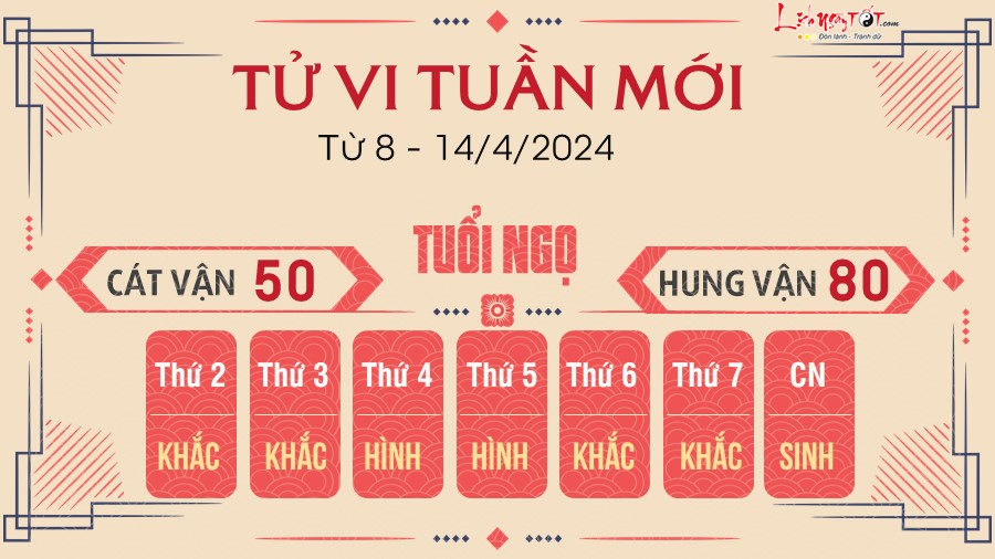 Tuổi Ngọ nên cẩn thận với thị phi và đường sức khỏe của bản thân trong tuần mới do ảnh hưởng từ Thiên Cẩu và Tả Phù, công việc vẫn đang dày vò bạn, sắp tới sẽ có ánh sáng hy vọng nên bạn đừng tìm kiếm rắc rối nữa.