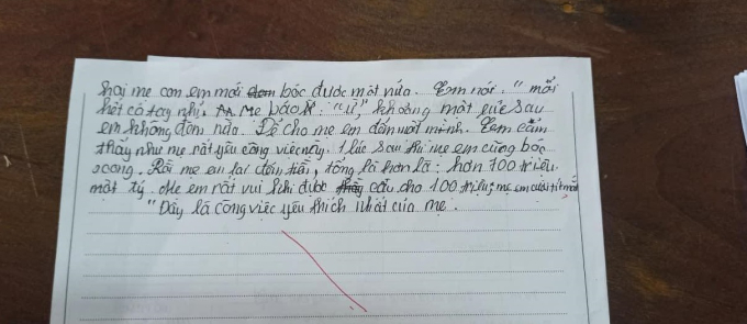 Khoảng 2 tiếng sau hai mẹ con em mới bóc được một nửa. Em nói 'Mỏi hết cả tay nhỉ?' Mẹ bảo 'Ừ', khoảng một lúc sau em không đếm nữa. Để cho mẹ em đếm một mình. Em cảm thấy như mẹ rất yêu công việc này. 1 lúc sau thì mẹ em cũng bóc xong. Rồi mẹ em lại đếm tiền, tổng lại hơn là: hơn 700 triệu một tý. Mẹ em rất vui khi được cậu cho 100 triệu, mẹ cười tít mắt 'Đây là công việc yêu thích nhất của mẹ'".