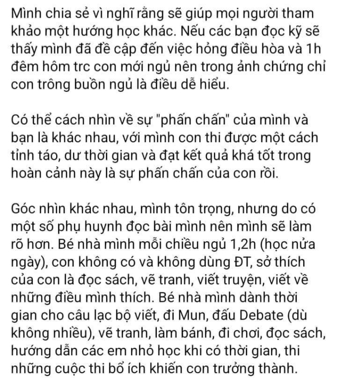 Trước ý kiến cho rằng con vị này học tập suốt ngày không có khoảng nghỉ ngơi, người mẹ phản pháo: "Góc nhìn khác nhau, mình tôn trọng, nhưng do có một số phụ huynh đọc bài mình nên mình sẽ làm rõ hơn. Bé nhà mình mỗi chiều ngủ 1,2h (học nửa ngày), con không có và không dùng điện thoại, sở thích của con là đọc sách, vẽ tranh, viết truyện, viết về những điều mình thích. Bé nhà mình dành thời gian cho câu lạc bộ viết, đi Hội nghị mô phỏng Liên Hợp Quốc, đấu Debate (dù không nhiều), vẽ tranh, làm bánh, đi chơi, đọc sách, hướng dẫn các em nhỏ học khi có thời gian, thi những cuộc thi bổ ích khiến con trưởng thành".