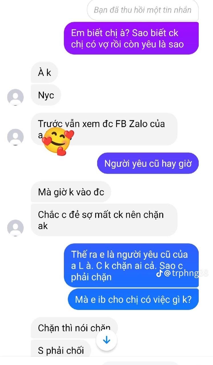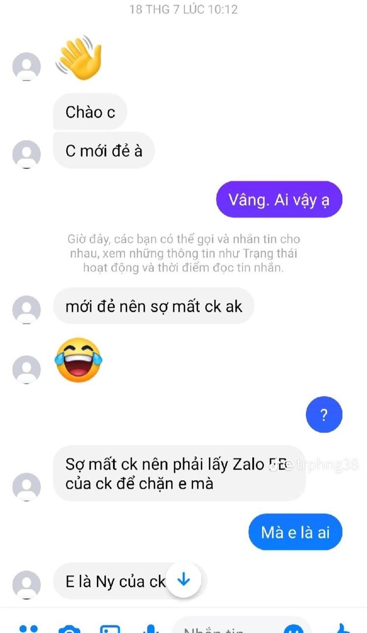 Một ngày có lẽ là quên không xem hoàng đạo, chị vợ mới sinh bất ngờ nhận được tin nhắn từ một nhân vật tự giới thiệu là người yêu cũ của chồng. Chẳng thăm, chẳng hỏi, vừa mở miệng cô gái này đã lập tức giở giọng khiêu khích khiến ai đọc cũng muốn "tăng xông".