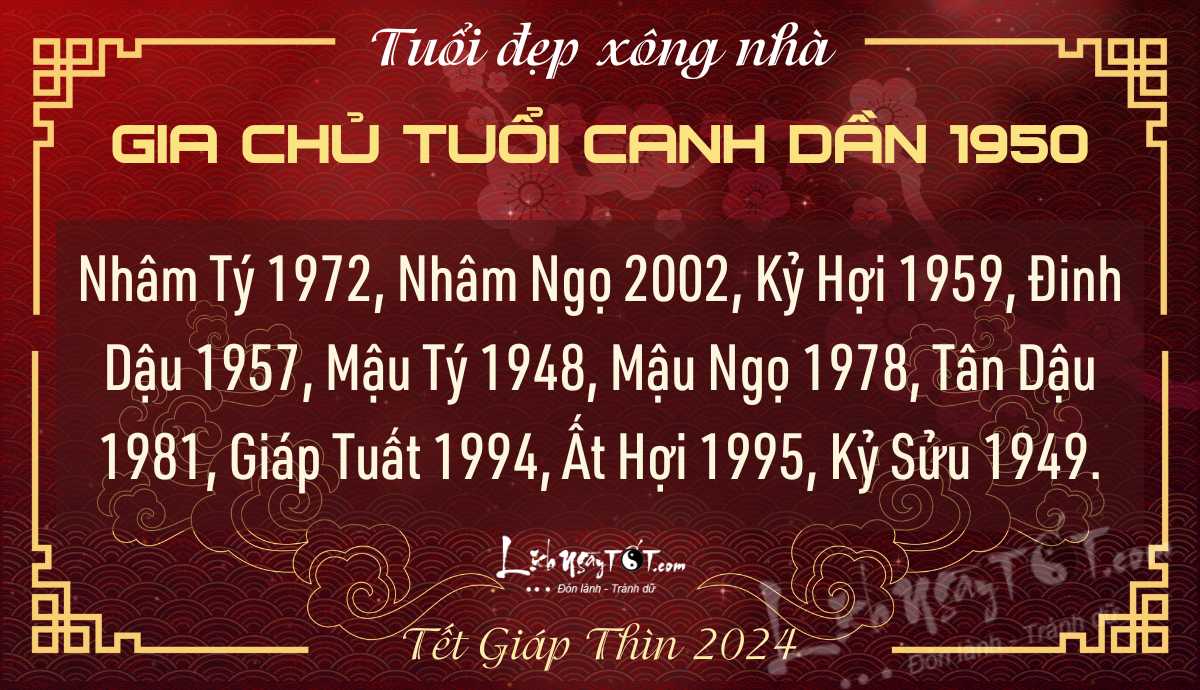 Cầu quý nhân vượng, gặp nhiều may mắn, được người tốt trợ giúp lúc khó khăn: Chọn các tuổi Canh Tuất 1970, Quý Hợi 1983, Canh Dần 2010 tới xông nhà.