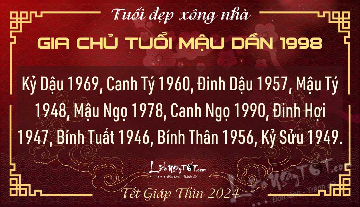 Tuổi XẤU nên tránh: Nhâm Dần 1962 (Xấu), Mậu Tuất 1958 (Xấu), Kỷ Sửu 1949 (Xấu), Mậu Tý 1948 (Xấu), Tân Hợi 1971 (Xấu), Mậu Ngọ 1978 (Xấu), Kỷ Mùi 1979 (Xấu), Quý Hợi 1983 (Xấu), Đinh Mão 1987 (Xấu), Nhâm Thân 1992 (Xấu).