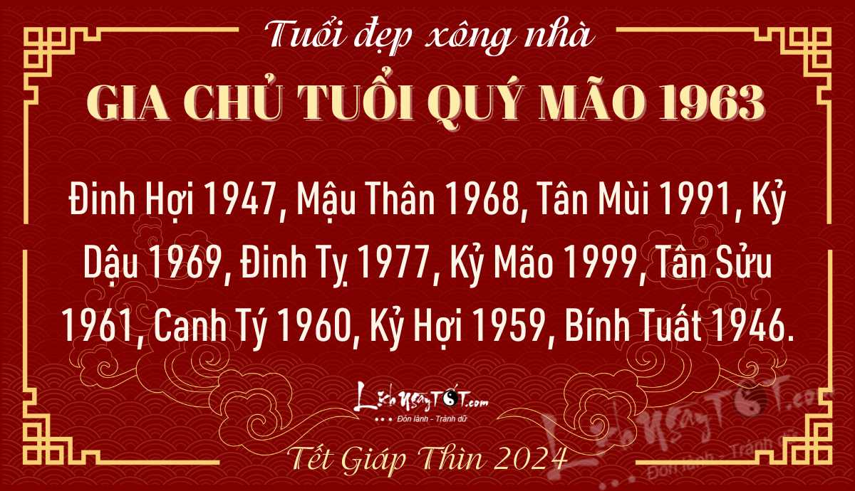 15/01/2024 23:06Xem tuổi xông nhà năm 2024 cho gia chủ tuổi Mão vượt mặt Thái Tuế, thành công đơm trái, tình ái đơm hoa năm mới!