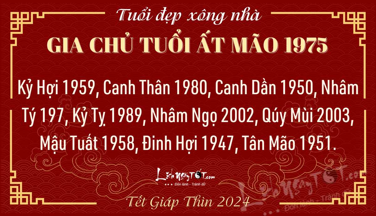 Tuổi XẤU nên tránh: Ất Mão 1975 (Xấu), Tân Hợi 1971 (Xấu), Quý Tỵ 1953 (Xấu), Nhâm Thìn 1952 (Xấu), Ất Dậu 1945 (Xấu), Canh Ngọ 1990 (Xấu), Nhâm Thân 1992 (Xấu), Đinh Sửu 1997 (Xấu), Giáp Tý 1984 (Xấu), Nhâm Dần 1962 (Xấu).