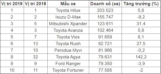 Xét riêng thương hiệu, Toyota thắng lớn khi góp sáu trong top 10 mẫu xe bán chạy nhất: Hilux, Vios, Avanza, Rush, Agya và Fortuner. Trong đó, mức tăng trưởng cao và ấn tượng nhất (142%) thuộc về Toyota Agya (Wigo tại Việt Nam), giúp mẫu xe đô thị cỡ nhỏ nhảy liền 24 bậc trong 2018 lên vị trí thứ tám trong số các mẫu xe được ưa chuộng nhất ASEAN 2019.