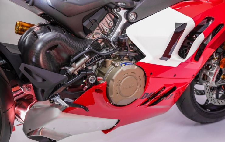 Công nghệ đua của Ducati được gắn trên Panigale V4R với thanh đầu nối trục khuỷu bằng titan. Các piston giờ nhẹ hơn, giảm trọng lượng đáng kể, mà vẫn tăng tốc độ động cơ. Các chi tiết khác cũng được điều chỉnh giúp cải thiện sự hoạt động của động cơ ở vòng tua máy cao và tăng tối đa sức mạnh đầu ra khi Panigale V4R đi kèm với ống xả đua. Ở chế độ thiết lập đua hoàn toàn, siêu xe này có thể đạt công suất tối đa lên tới 240,5 mã lực.