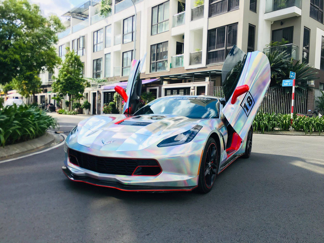 Chiếc Chevrolet Corvette được rao bán thuộc phiên bản C7 Stingray. Toàn bộ ngoại thất bắt mắt là decal được chủ xe dán trùm. Nguyên bản khi về nước, chiếc Chevrolet Corvette C7 Stingray sở hữu gam màu đỏ. Xe độ thêm cánh gió cố định phía sau với giá trị 4.300 USD, giúp tăng trọng lượng đuôi xe và ghì đuôi xe bám sát mặt đường ở tốc độ cao. Cửa xe dạng cắt kéo được độ thêm với chi phí 2.900 USD, body carbon được bổ sung với tổng chi phí 3.000 USD.