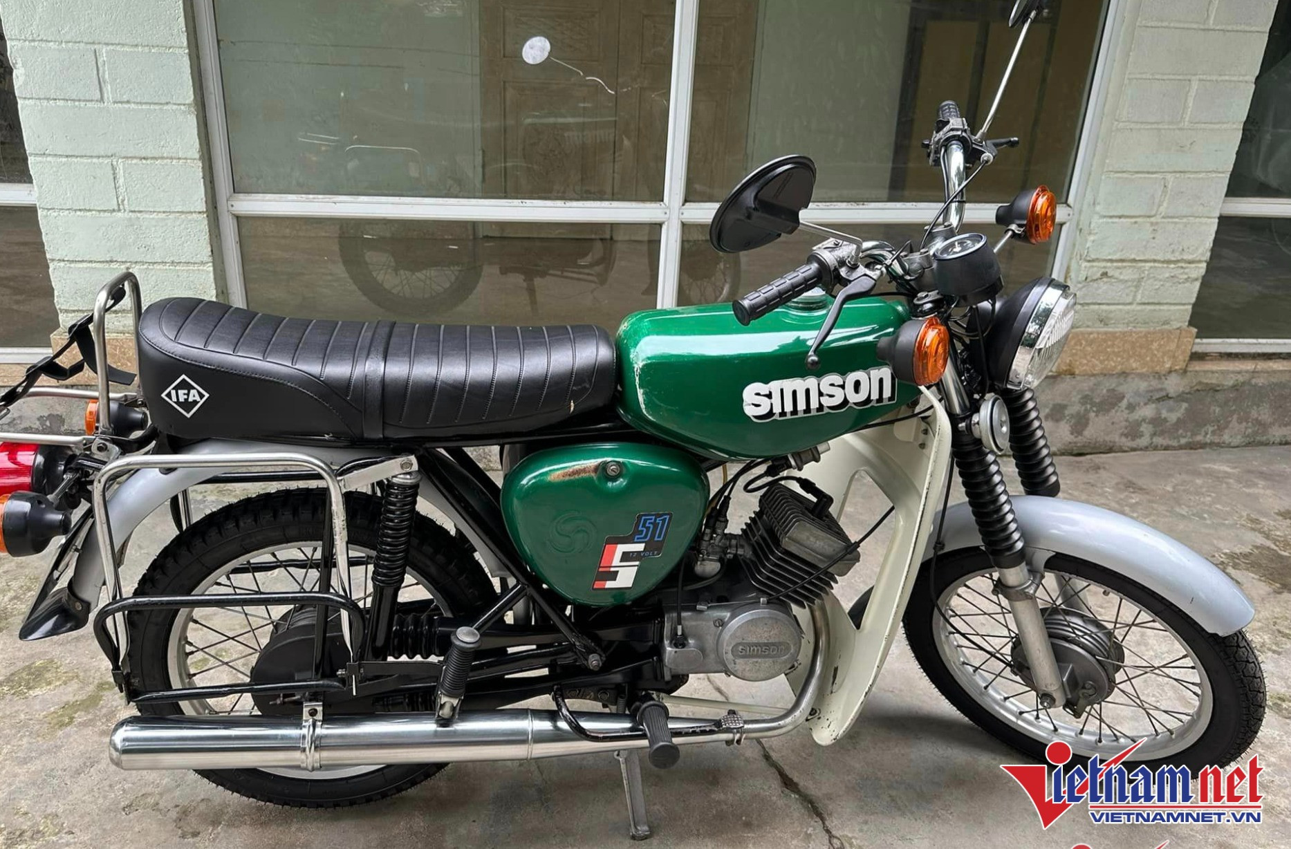 Bộ xe của anh Đức còn có chiếc Simson S51 12Vol mầu sơn xanh đu đủ sản xuất năm 1989 nguyên bản. “Tất cả đồ đạc trên xe đều còn mới đẹp. Ống xả, giá hàng, ghi đông, tay xách, tai xi nhan, thụt trước… đều nguyên bản 100%. Sau 34 năm, để kiếm được một chiếc xe chất còn đẹp từng chi tiết nhỏ như vậy là rất hiếm”, anh Đức chia sẻ.