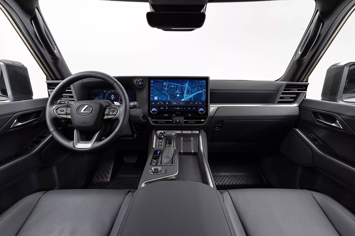 Bên trong, thiết kế của Lexus GX 2024 được vay mượn nhiều ý tưởng từ mẫu Lexus RX và LM. Các lỗ gió điều hòa trung tâm đều được đặt ở vị trí thấp dưới màn hình giải trí kích thước lớn lên tới 14 inch. Ghế ngồi có tùy chọn dạng 6 hoặc 7 chỗ ngồi.