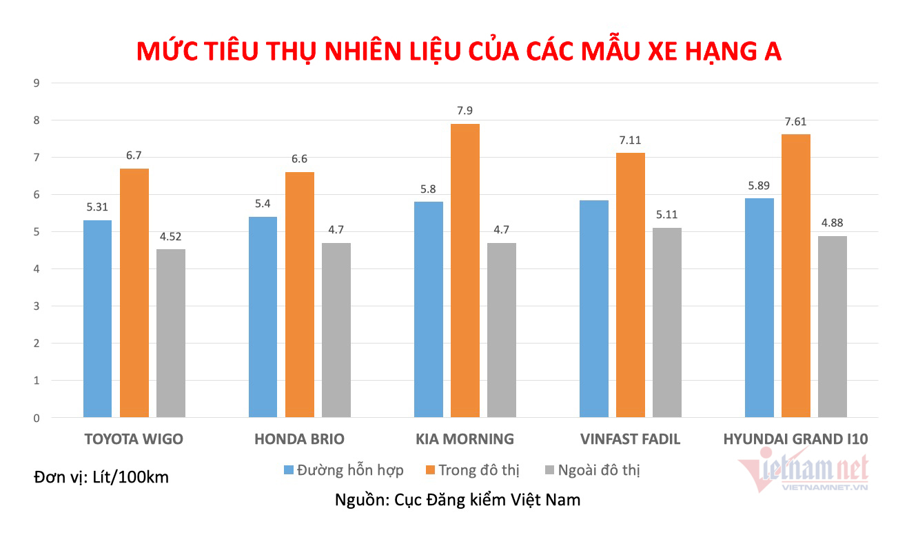 Theo số liệu về mức độ tiêu thụ nhiên liệu của hơn 500 mẫu xe do Cục Đăng kiểm Việt Nam công bố, tất cả các xe phân khúc A đời mới hiện nay chỉ tiêu hao trên 5 lít/100 km. Trong đó, mẫu xe tiết kiệm xăng nhất là phiên bản số sàn của Toyota Wigo.
