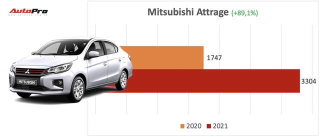 Mitsubishi Attrage cũng gây bất ngờ với mức tăng trưởng doanh số gần 90%. Tuy vẫn chưa phải mẫu xe bán chạy nhất phân khúc sedan hạng B nhưng với doanh số tăng mạnh trong quý II năm nay, Attrage đã từng có thời điểm bán vượt City và bỏ xa Soluto để đứng ở vị trí thứ 3 phân khúc, với doanh số 2 tháng liên tiếp đều trên 1.000 xe. Nhờ đó, Attrage cũng lọt top 10 xe bán chạy tại Việt Nam trong 2 tháng đó.