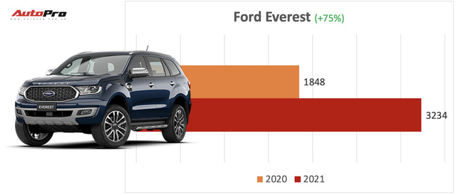 Mẫu SUV của Ford cũng bắt đầu bán chạy hơn sau bản nâng cấp hồi cuối năm 2020. Mặc dù không có quá nhiều thay đổi nhưng Everest mới đã được cơ cấu lại phiên bản, đồng thời giảm giá sâu tại đại lý. Giá xe nhiều tháng đầu năm nay giảm tới hơn 100 triệu đồng.