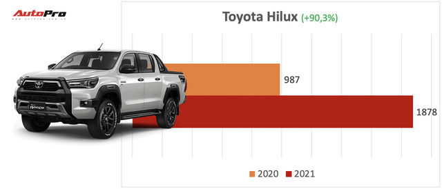 Toyota Hilux là mẫu xe có tốc độ tăng trưởng mạnh nhất trong nửa đầu năm 2021 so với cùng kỳ năm ngoái với mức tăng hơn 90%. Mặc dù xét trong phân khúc, doanh số Hilux vẫn còn thấp hơn nhiều so với đối thủ Ford Ranger nhưng đây đã là nỗ lực lớn của Hilux vươn lên vị trí thứ 2 phân khúc khi từng bị xếp ở vị trí cuối bảng trong một khoảng thời gian dài.