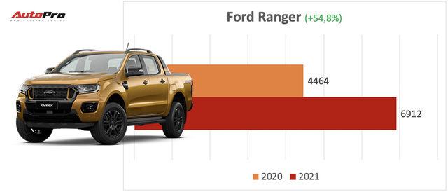 Giống mẫu SUV Everest, Ranger cũng không có nhiều thay đổi đáng kể trong lần cập nhật năm ngoái. Mặc dù vậy, doanh số Ranger vẫn tăng đều. Thậm chí, mẫu xe này còn bị ảnh hưởng về nguồn cung trong giai đoạn chuyển đổi sang lắp ráp trong nước vào tháng 6 vừa qua.