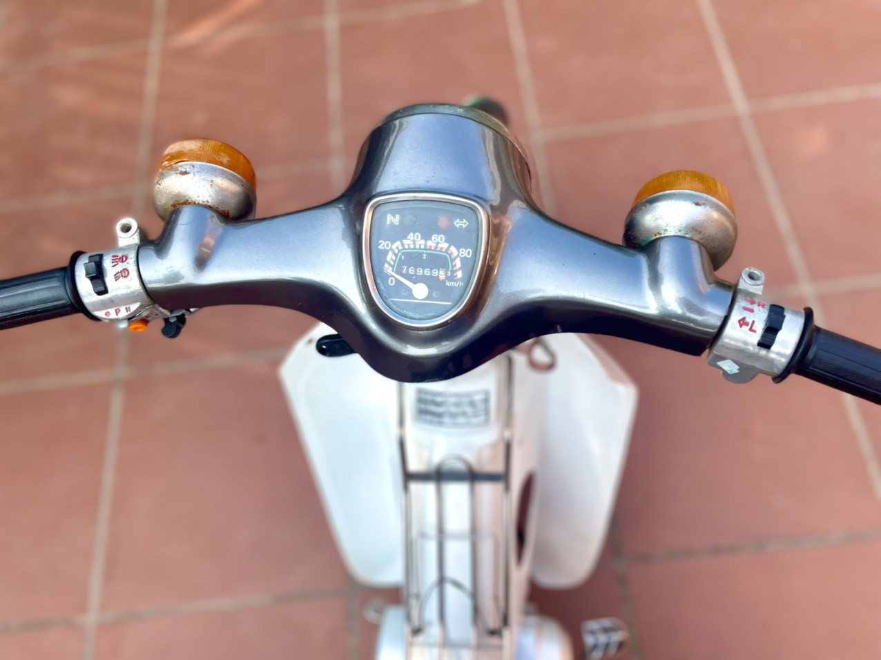 Đặc biệt, màu sơn ghi xám nguyên bản của chiếc xe vẫn còn giữ được độ bóng và sâu màu như xe mới, các tem dán thông số và logo Super Cub mạ bóng loáng, không bị ô xi hóa.