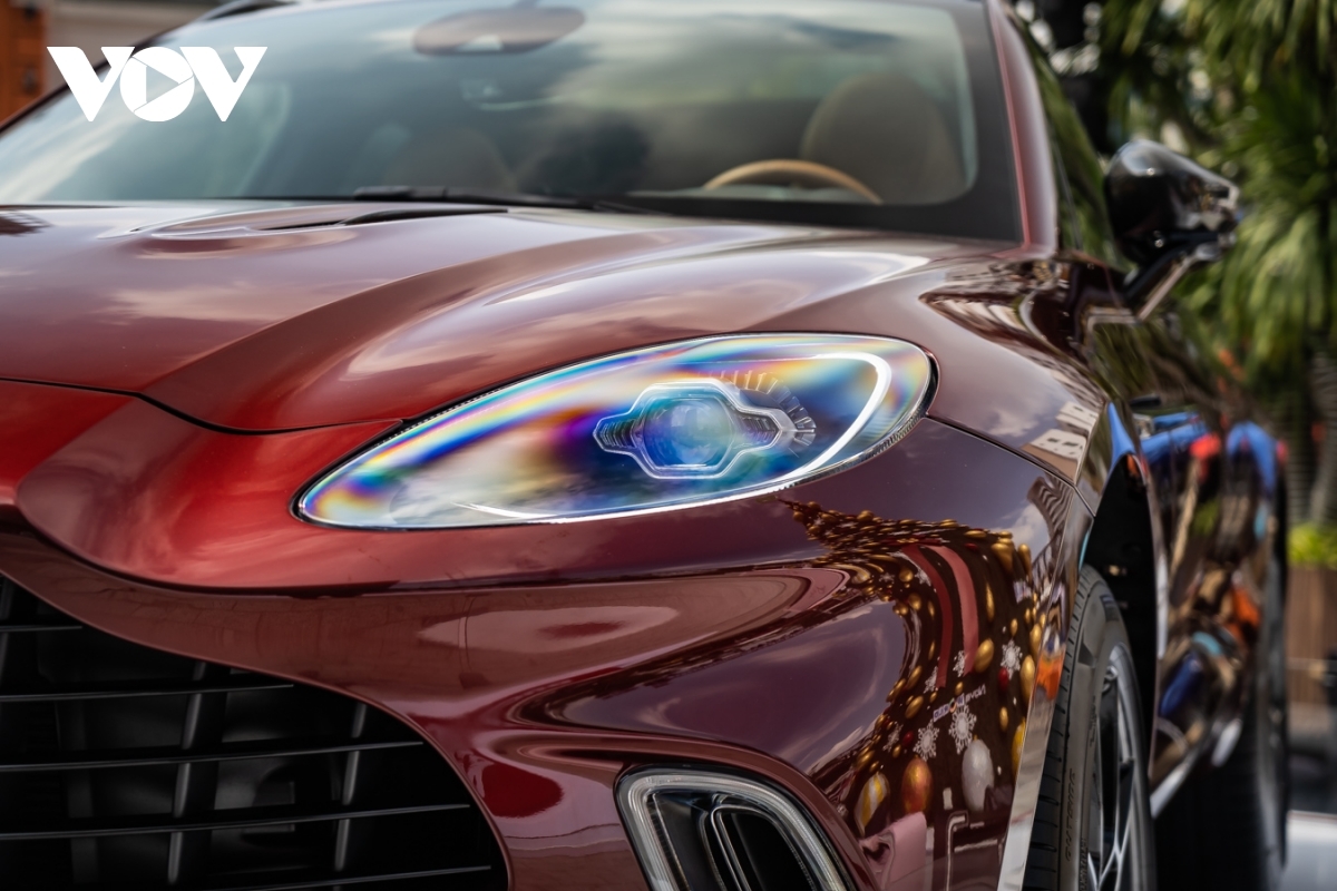 Chiếc Aston Martin DBX thứ hai tại Việt Nam nổi bật hơn với màu sơn đỏ mận Liquid Crimson, cùm phanh vàng kết hợp nhiều chi tiết được làm bằng sợi carbon, giá bán 16,68 tỷ đồng.