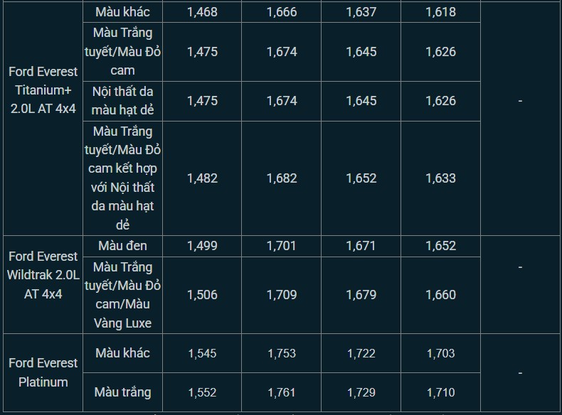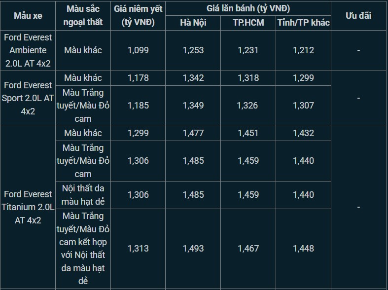 Tham khảo giá lăn bánh tạm tính xe Ford Everest tháng 5/2025: