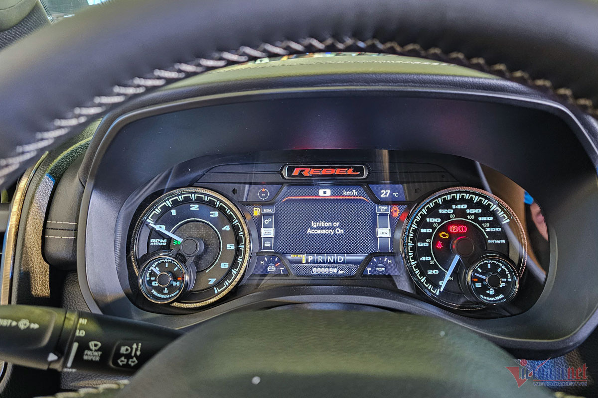 Màn hình giải trí trung tâm của RAM 1500 Rebal được thiết kế đặt dọc có kích thước lớn 12 inch, hỗ trợ kết nối không dây với Apple CarPlay và Android Auto, hệ thống âm thanh Harman Kardon với 19 loa có công suất 900W.