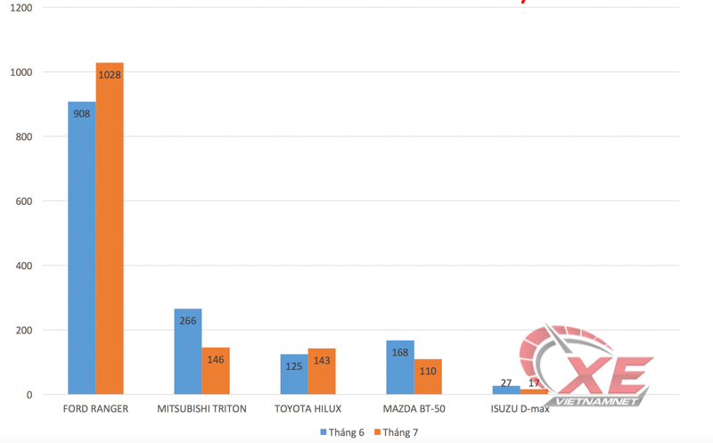 Trong đó, ngoài hai mẫu xe Ford Ranger và Toyota Hilux tăng trưởng đi lên so với tháng 6, phần còn lại đều rớt thê thảm. Đáng chú ý chỉ riêng số liệu bán hàng của Ford Ranger đã bằng gần 2,5 lần số liệu 4 mẫu xe Nhật cộng lại, gồm Mitsubishi Triton, Toyota Hilux, Mazda BT-50 và Isuzu D-max.