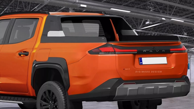 Digimods đã chọn một hướng đi truyền thống hơn, kết hợp phần đầu xe của RAV4 với khung gầm rời của Tacoma và thùng xe phía sau tiêu chuẩn. Nhà thiết kế này thậm chí còn tạo thêm nét cá tính bằng cách thêm đèn hậu đặt ngang từ RAV4 vào cửa sau.
