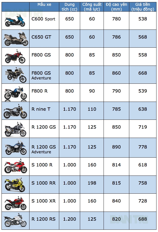 Hiện tại, các dòng xe máy do BMW Motorrad cung cấp cho thị trường Việt Nam đều không có gì thay đổi so với tháng 5/2017; cụ thể như sau: