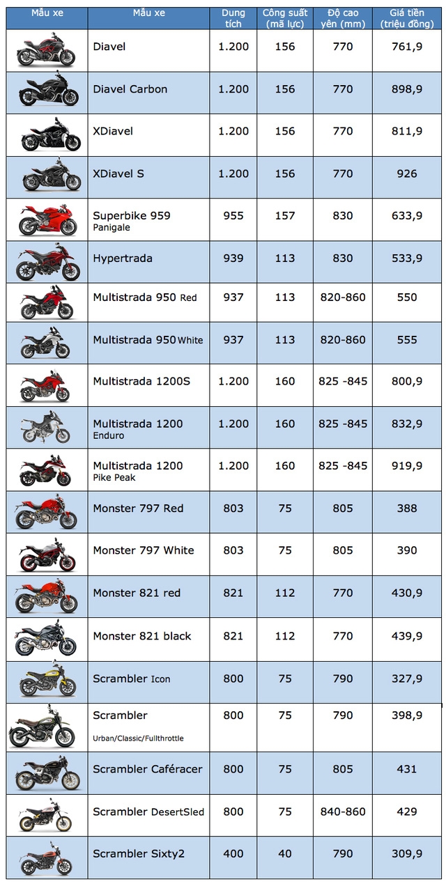 Trong số các xe Ducati hiện được phân phối chính hãng tại Việt Nam, giá bán thấp nhất là mẫu Scrambler Sixty2 giá bán khởi điểm từ 309,9 triệu đồng, và đắt tiền nhất là mẫu Multistrada 1200 giá 919,9 triệu đồng.