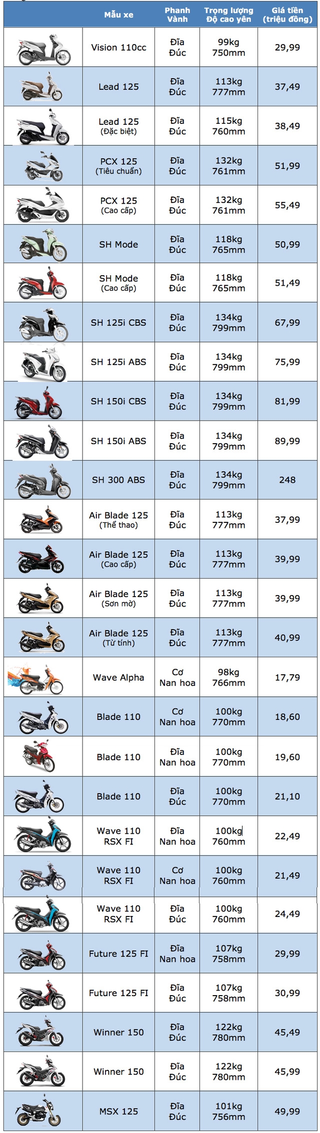 Bảng giá xe máy Honda tại Việt Nam