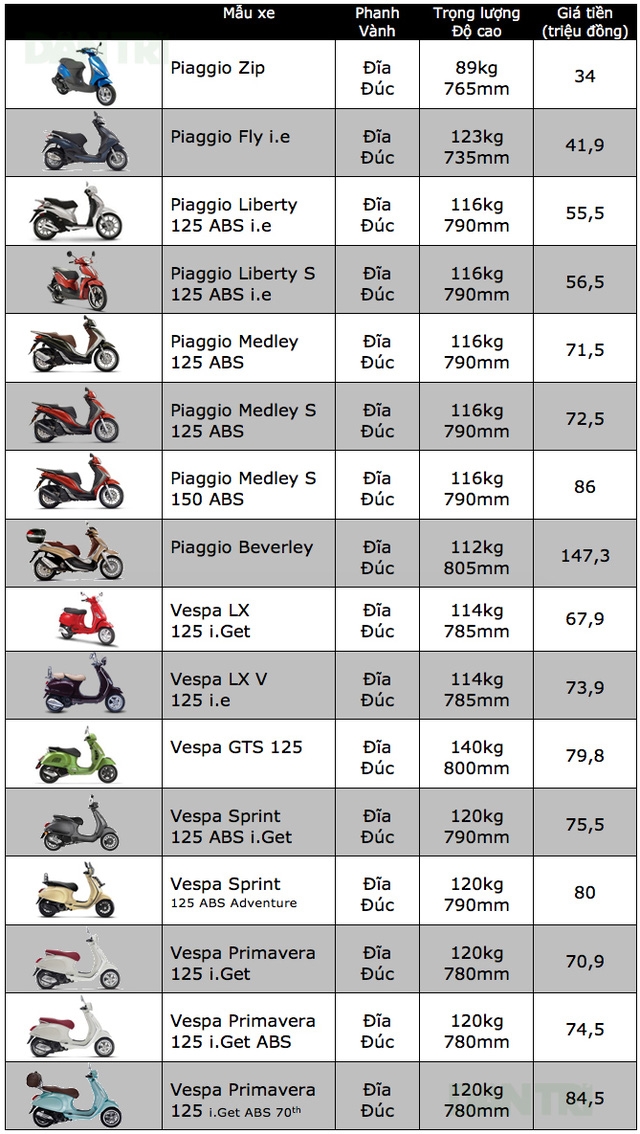 Cụ thể giá bán các mẫu xe Piaggio tại Việt Nam như sau: