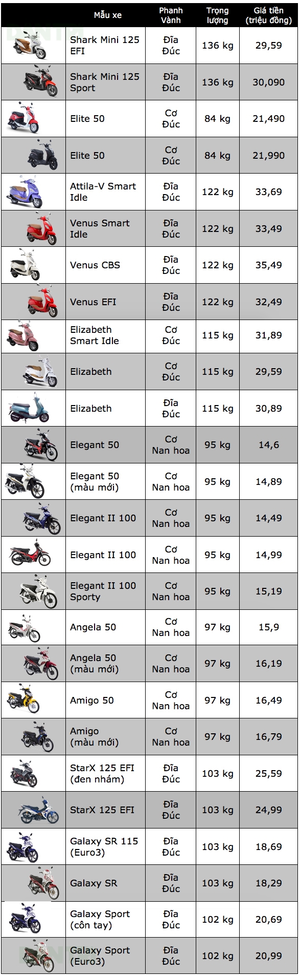 Bảng giá xe máy SYM tại Việt Nam