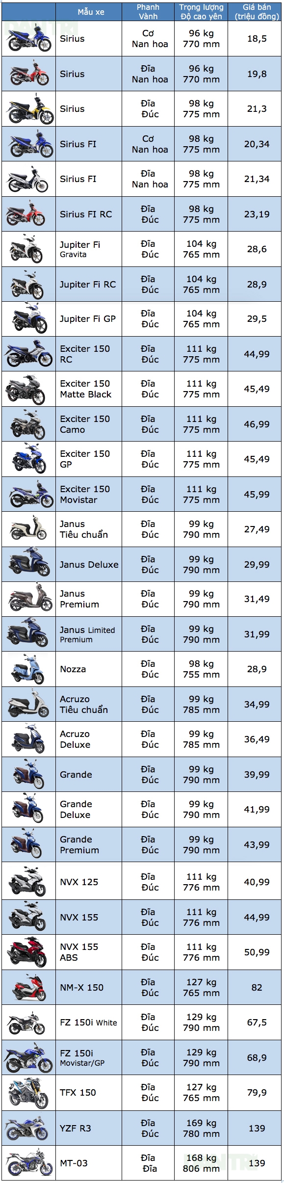 Bảng giá xe máy Yamaha tại Việt Nam