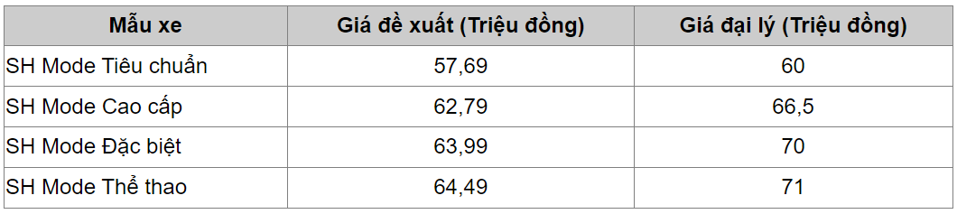 05/03/2023 13:57Bảng giá Honda SH Mode đầu tháng 3/2023, chênh từ hơn 2 triệu đồng