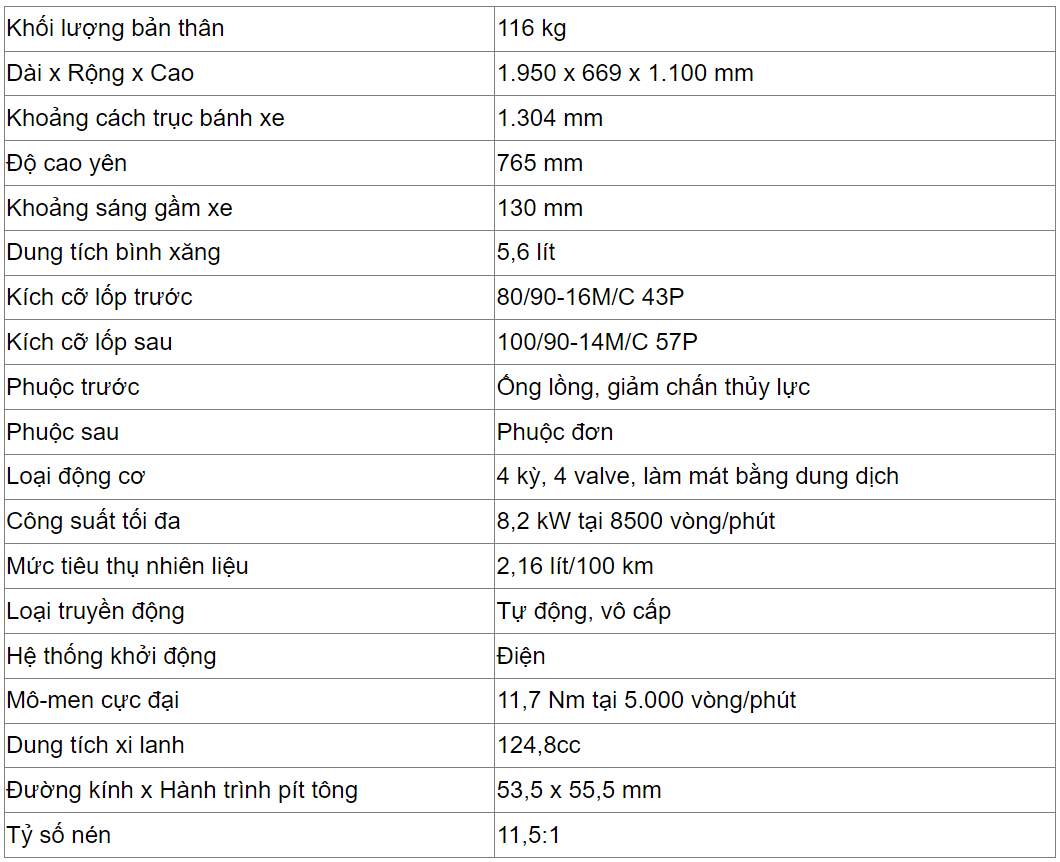 Bảng thông số kỹ thuật chi tiết của Honda SH Mode: