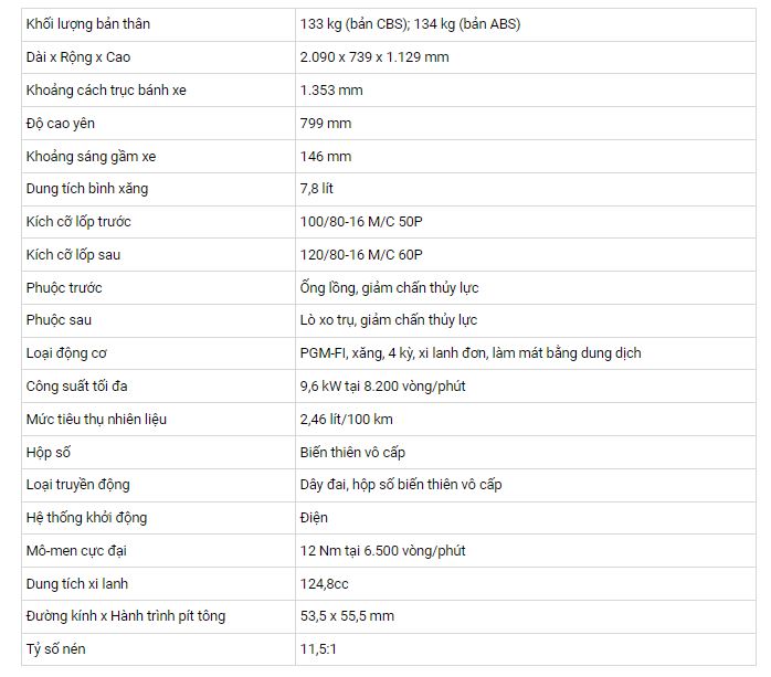 Mặt đồng hồ xe thông minh với loại màn hình kỹ thuật số. Trên xe có hàng loạt các trang bị hiện đại với hệ thống phanh đĩa có CBS hoặc ABS tùy bản, nắp bình xăng đặt phía trước tiện lợi cho việc đổ xăng, chia khóa xe loại thông minh Smart Key, và các công tắc đa năng trên thanh tay lái. Xe lại được trang bị động cơ eSP+ 4 valve thế hệ mới, đánh dấu bước đột phá trong công nghệ động cơ của Honda, không những giúp xe vận hành vượt tội mà còn tiết kiệm xăng.