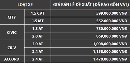 Giá bán lẻ đề xuất các mẫu ôtô Honda ở Việt Nam. Nguồn: Hondaoto. |