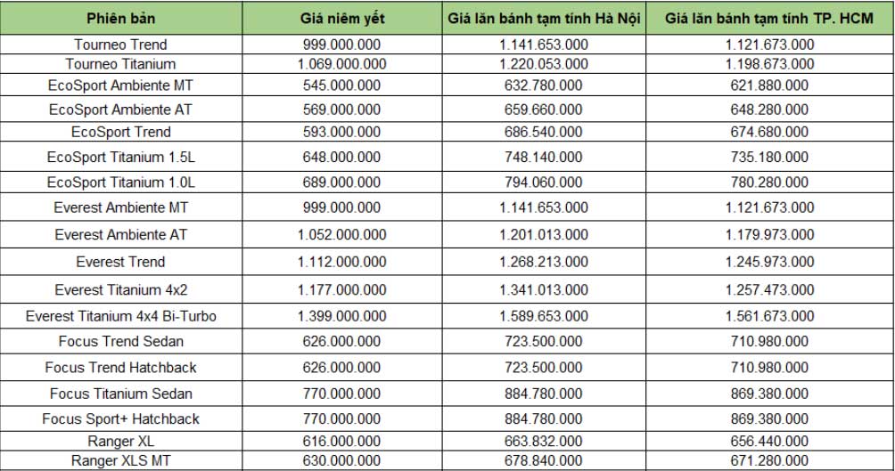 Bảng giá chi tiết ô tô Ford trong tháng 12/2019: