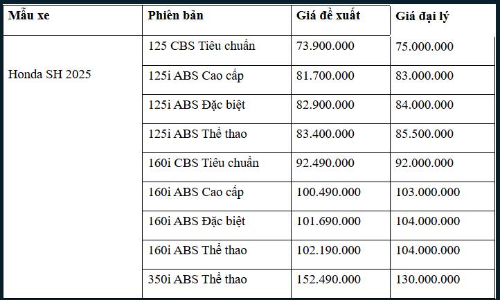 Lưu ý: Bảng giá Honda SH nêu trên chỉ mang tính chất tham khảo. Khách hàng có thể trực tiếp đến các đại lý Honda Uỷ nhiệm (HEAD) để nắm được mức giá chính xác nhất.