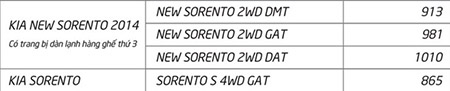 Kia Morning 1.0MT có giá bán thấp nhất 324 triệu đồng trong khi New Sorento 2WD DAT giá cao nhất với 1,01 tỷ đồng.