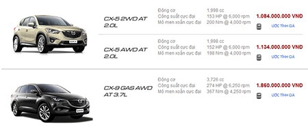 Mazda 2 MT 1.5L là model có giá bán thấp nhất 527 triệu đồng, trong khi Mazda CX-9 giá cao nhất 1,86 tỷ đồng.