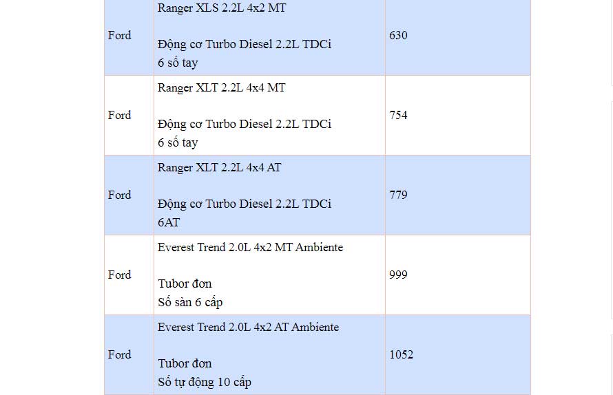 Trong số đó, mẫu Ford Everest phiên bản Ambiente 2.0L AT 4x2 có giá niêm yết là 1.052 tỉ đồng và được ưu đãi lên đến 50 triệu đồng. Các phiên bản khác được ưu đãi 20-25 triệu đồng.
