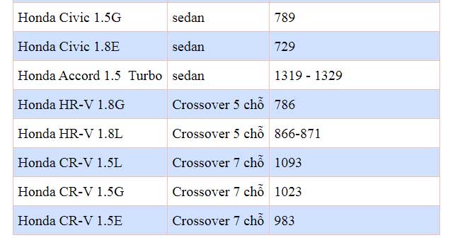 Cụ thể bảng giá xe ô tô Honda tham khảo tháng 1/2020: