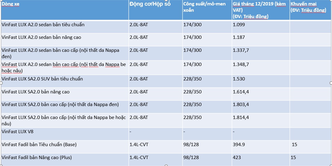05/12/2019 13:21Bảng giá xe VinFast tháng 12: Đại lý giảm nhẹ giá Fadil để cạnh tranh với Kia Morning
