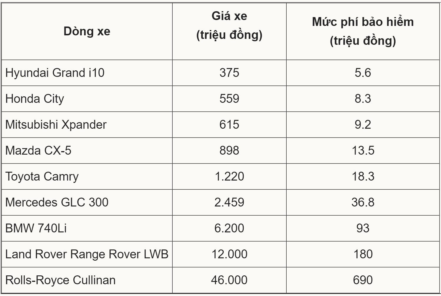Bảng tham khảo mức phí bảo hiểm của các dòng xe ở các phân khúc, giả sử xe mới đời 2020, hệ số bảo hiểm là 1,5%: