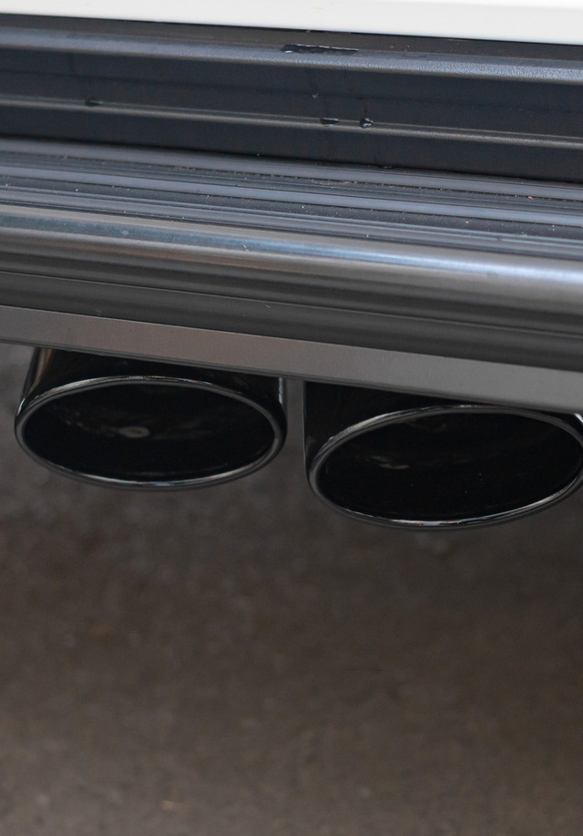Chưa dừng ở đó, nguyên bản mẫu G350 d có hệ thống ống xả được giấu dưới gầm xe nhưng chiếc xe này đã được lắp đặt ống xả kép sơn đen lộ ra ngoài 2 bên hông xe. Bộ mâm 5 chấu kép kích thước 18 inch đã được nâng cấp lên bộ mâm đa chấu kích thước 22 inch của hãng độ Brabus.