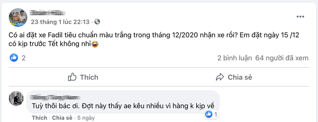 Một khách hàng tại Bắc Ninh đặt chiếc Fadil vào ngày 14/12/2020. Đại lý hứa hẹn giao trong tháng 1/2021 nhưng nay đã gần cuối tháng mà vẫn chưa có xe. Người bán tiếp tục xin hoãn thời gian giao xe đến tháng 2 và không chắc chiếc xe này có kịp giao trước Tết hay không.