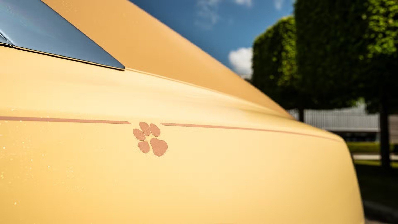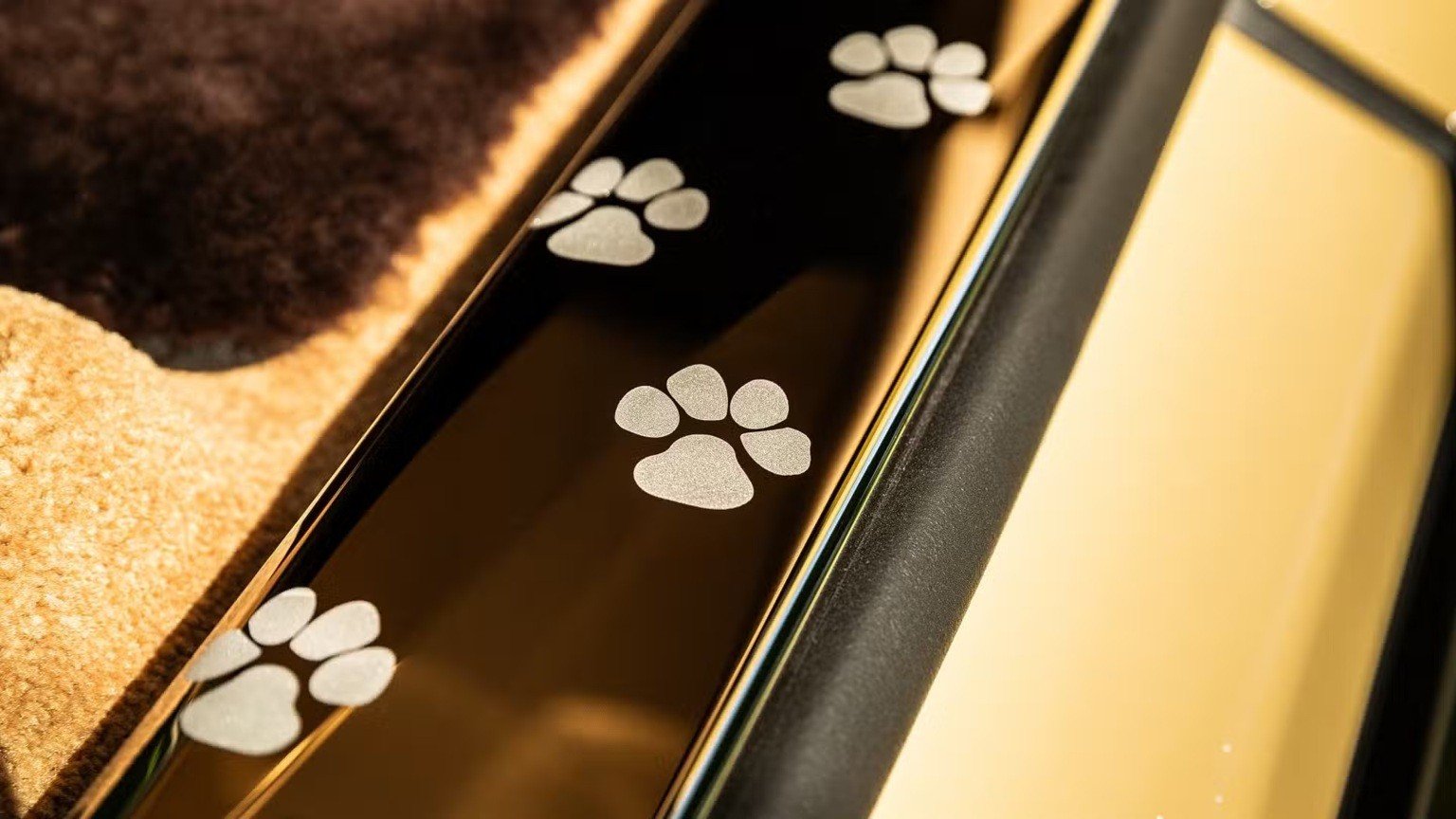 Ngoài ra, bảng táp-lô phía ghế phụ cũng được khảm dấu chân chú chó bằng gỗ. Bậc cửa được chạm khắc hình dấu chân màu vàng hồng bóng loáng, tạo nên sự khác biệt cho mỗi lần bước lên xe.