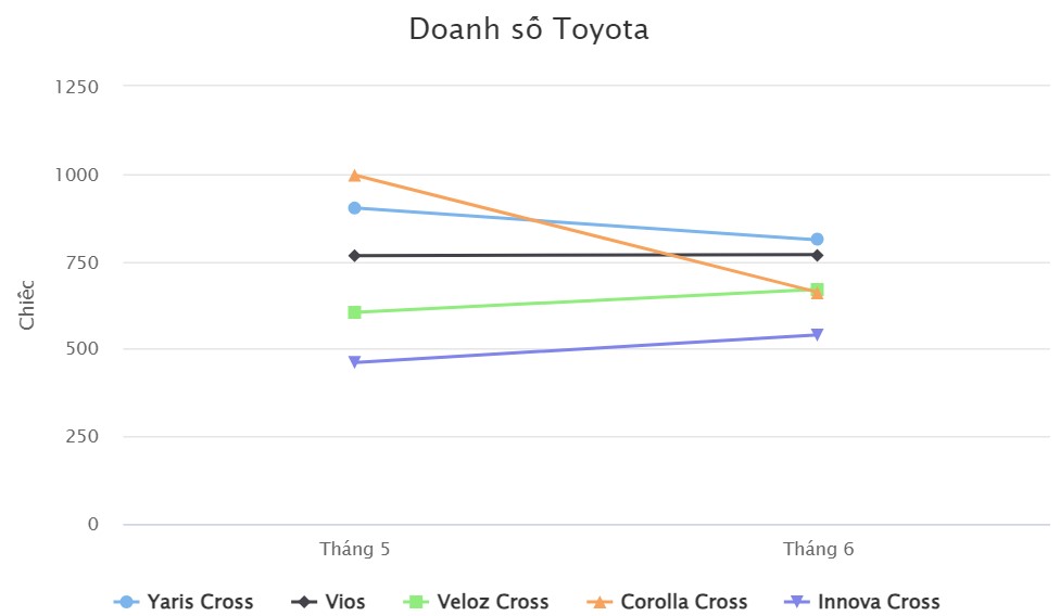 Đứng ở vị trí thứ hai là mẫu sedan hạng B Toyota Vios với doanh số 769 xe, tăng nhẹ 0,39% so với tháng 5 (766 xe). Vị trí thứ ba thuộc về Toyota Veloz Cross với doanh số tăng 10,9% lên 670 xe ( tháng 5 hãng bán ra 604 xe).