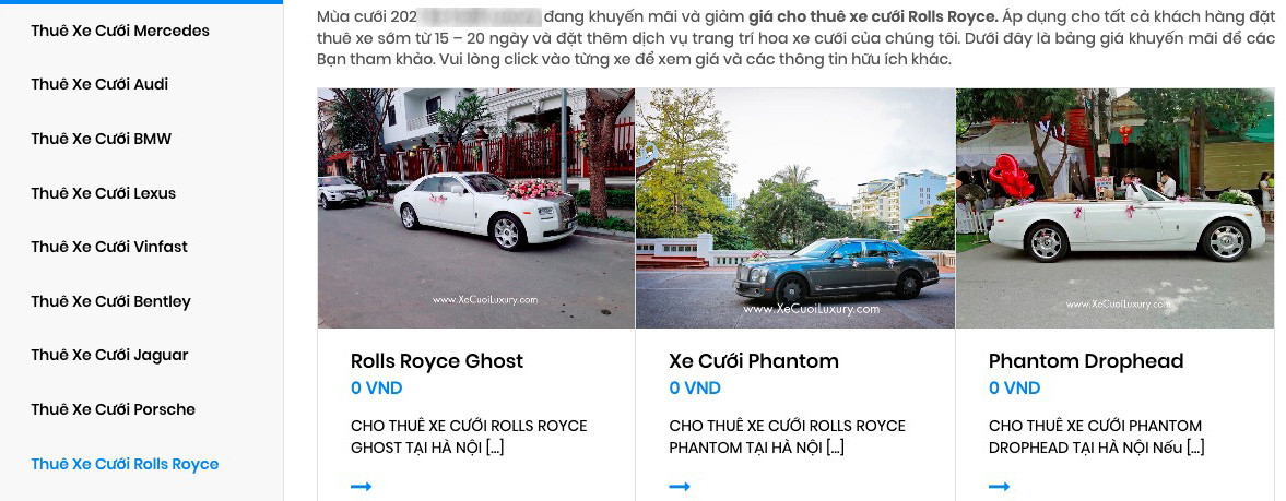 Tại một địa chỉ khác trên quận Đống Đa (Hà Nội), chiếc Rolls-Royce Phantom được cơ sở này báo giá cho thuê để làm xe hoa trong vòng 5 giờ với phạm vi di chuyển 40km là 30 triệu đồng. Ngoài phục vụ đám cưới, nếu thuê chiếc xe trên để đưa đón khách đi sân bay với quãng đường 70km là 17 triệu/2 giờ; còn thuê xe để chụp ảnh, quay phim trong phạm vi di chuyển 15km là 13 triệu/2 giờ.