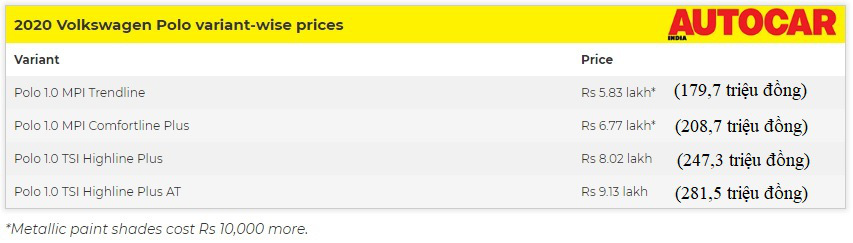 Volkswagen cung cấp cho chiếc Polo BS6 với ba biến thể - hai phiên bản thấp hơn có động cơ 1.0 MPI, trong khi phiên bản hàng đầu của mẫu xe này được sử dụng động cơ 1.0 TSI. Giá bán của các phiên bản xe được liệt kê dưới đây: