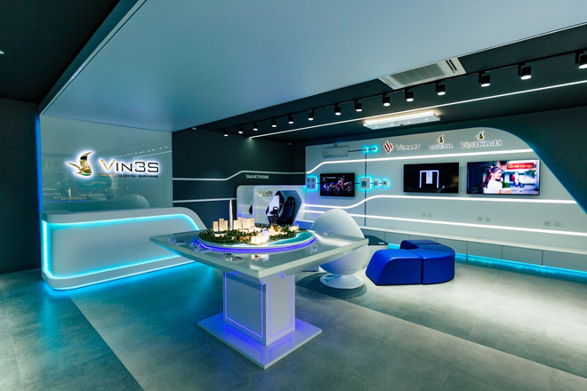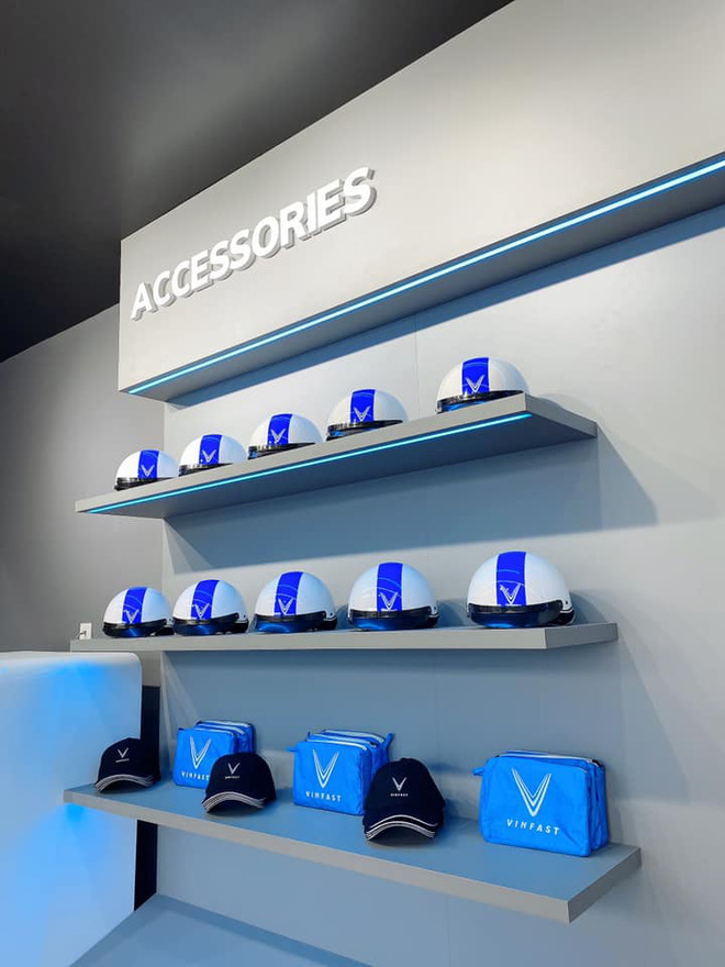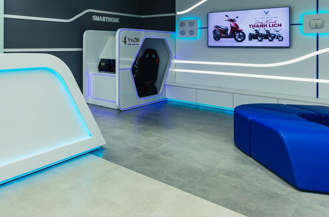 Mỗi trung tâm xe máy điện VinFast có diện tích 300 m2, tông màu xanh dương chủ đạo, thiết kế tối giản kết hợp với hệ thống ánh sáng mang hơi hướng công nghệ, viễn tưởng tương lai.